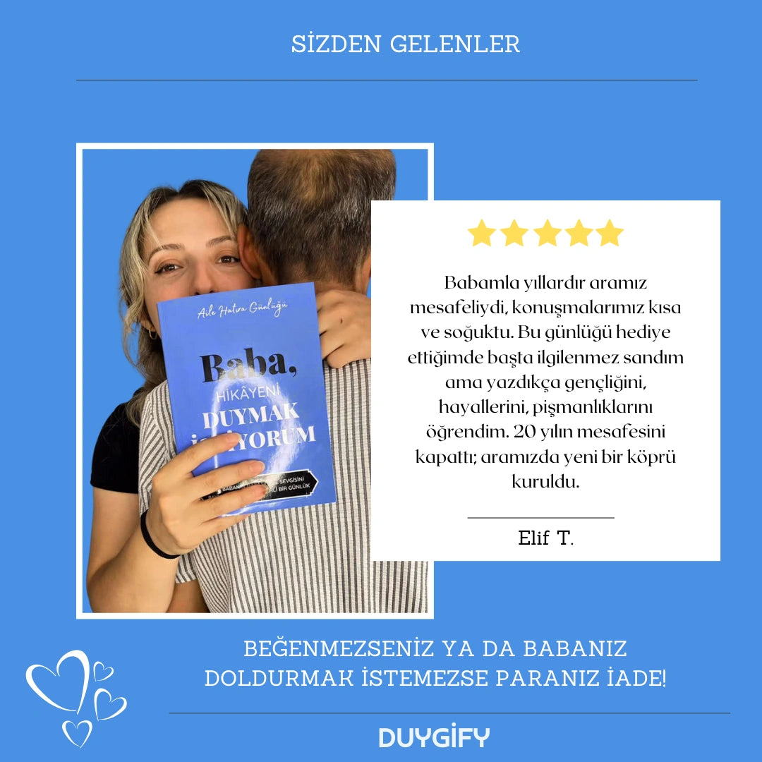 Duygify™ Baba Hikaye Günlüğü, babalar başta olmak üzere tüm aile bireylerinin hayat hikayelerini paylaşması için hazırlandı. Aynı zamanda büyükbabalar, amcalar ya da hayatınızdaki önemli erkek figürler için de harika bir hediye seçeneğidir.