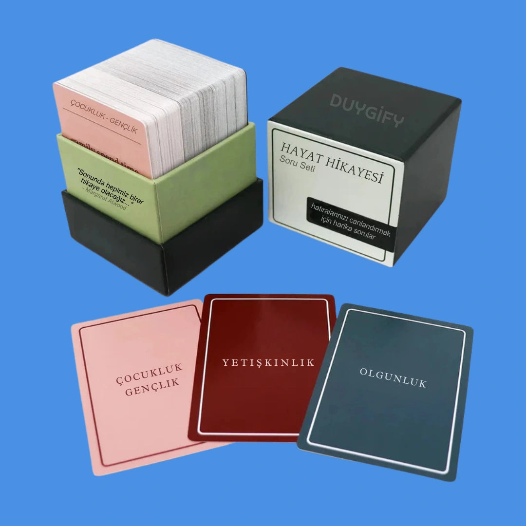 Annenizin ilk aşkı, babanızın çocukluk hayalleri, büyükbabanızın gençlik maceraları... Bu hikayeler şu anda onların kalbinde saklı, ama her geçen gün biraz daha silikleşiyor. Duygify™ Hikaye Keşif Kartları, ailenizdeki en özel insanların hiç anlatmadığı o gizli hikayeleri ortaya çıkaran 150 büyülü sorudan oluşuyor. Çünkü en güzel hikayeler sorulmayı bekleyen sorularda gizlidir - bugün sormadığınız soruları yarın sormak için kimse kalmayabilir...